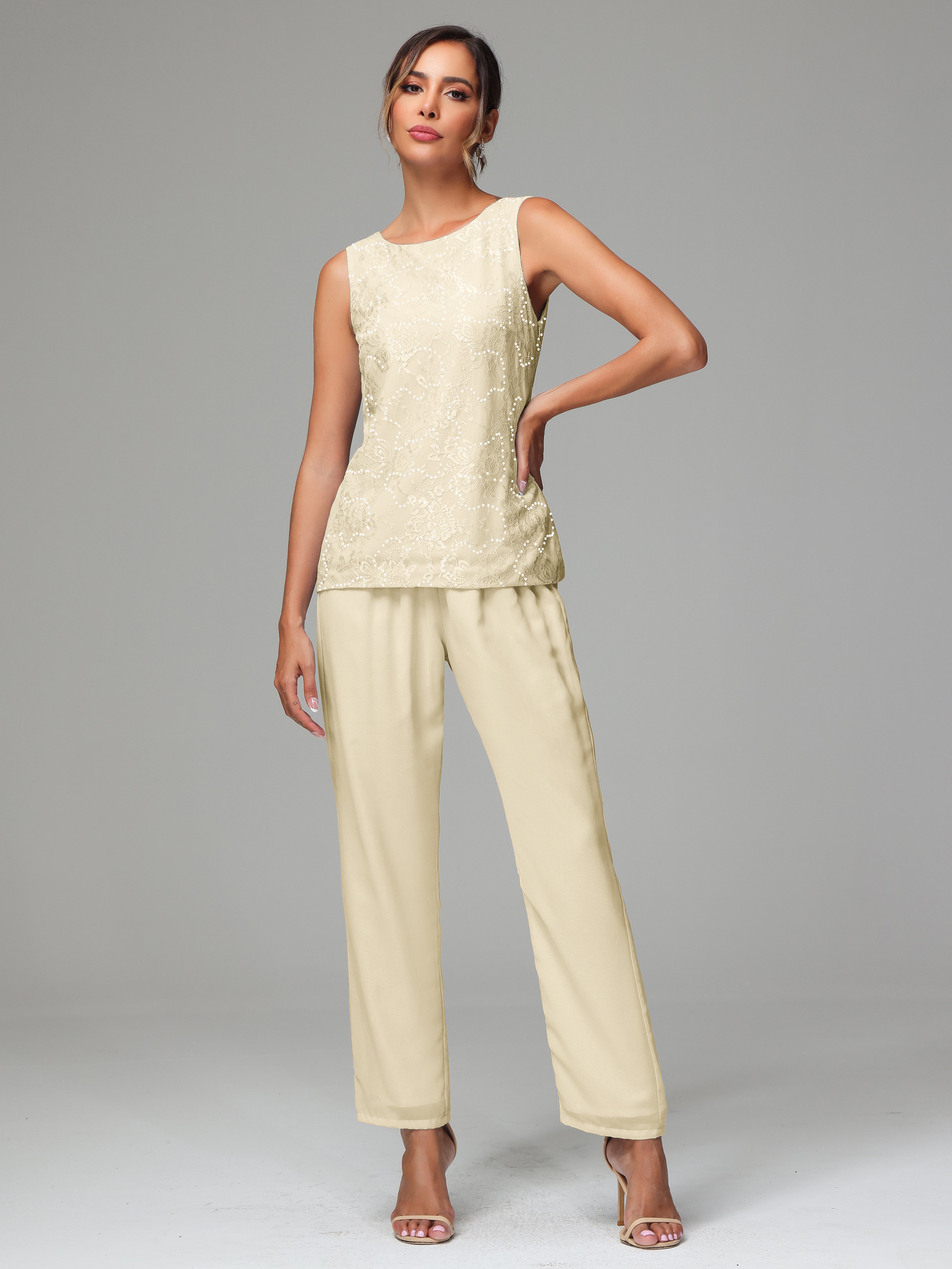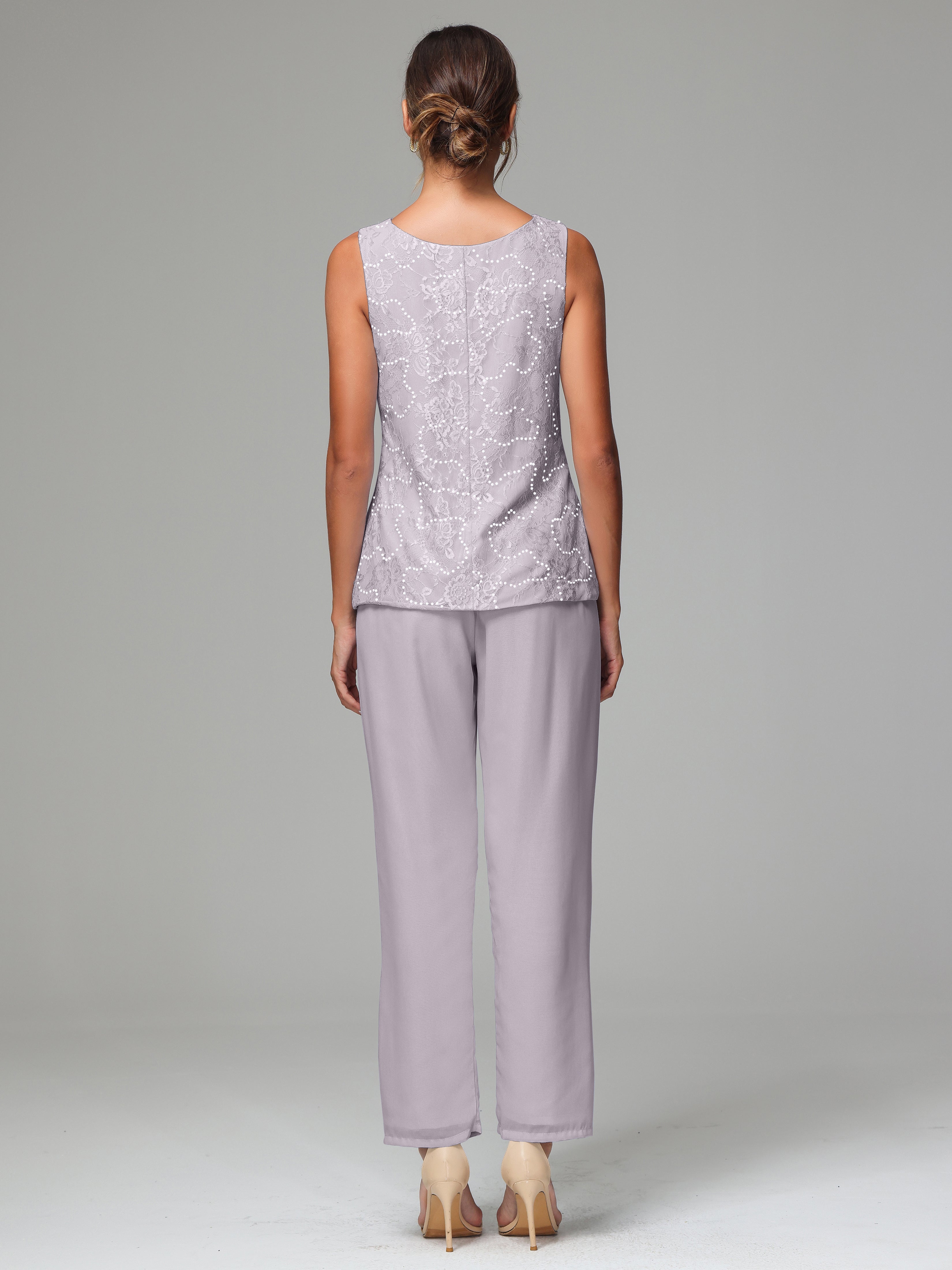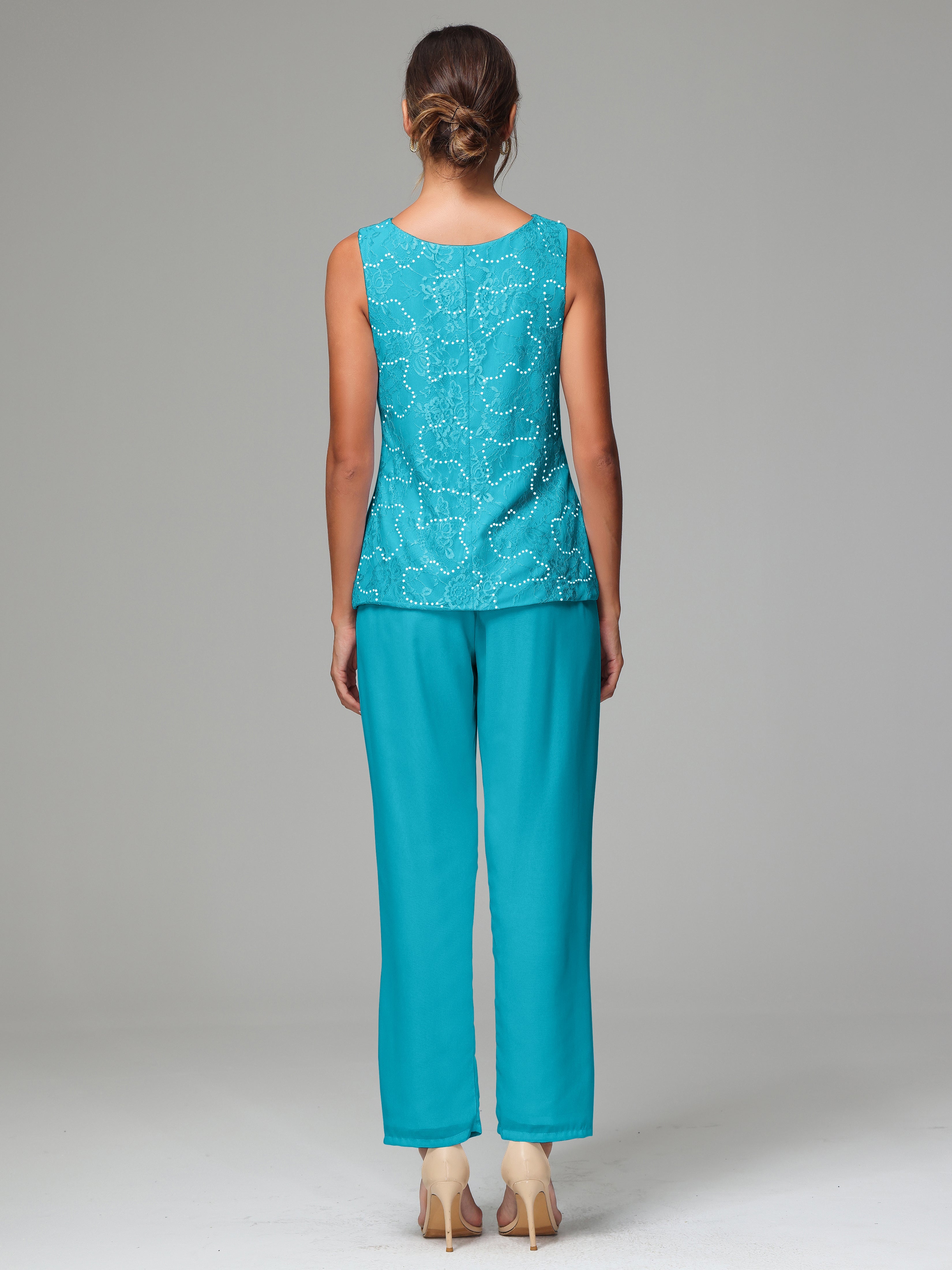 This three-piece chiffon lace mother of the bride dress pants suit offers a graceful, yet versatile look. Featuring long sleeves and a fashionable chiffon lace fabric, this timeless ensemble is perfect for any formal occasion.