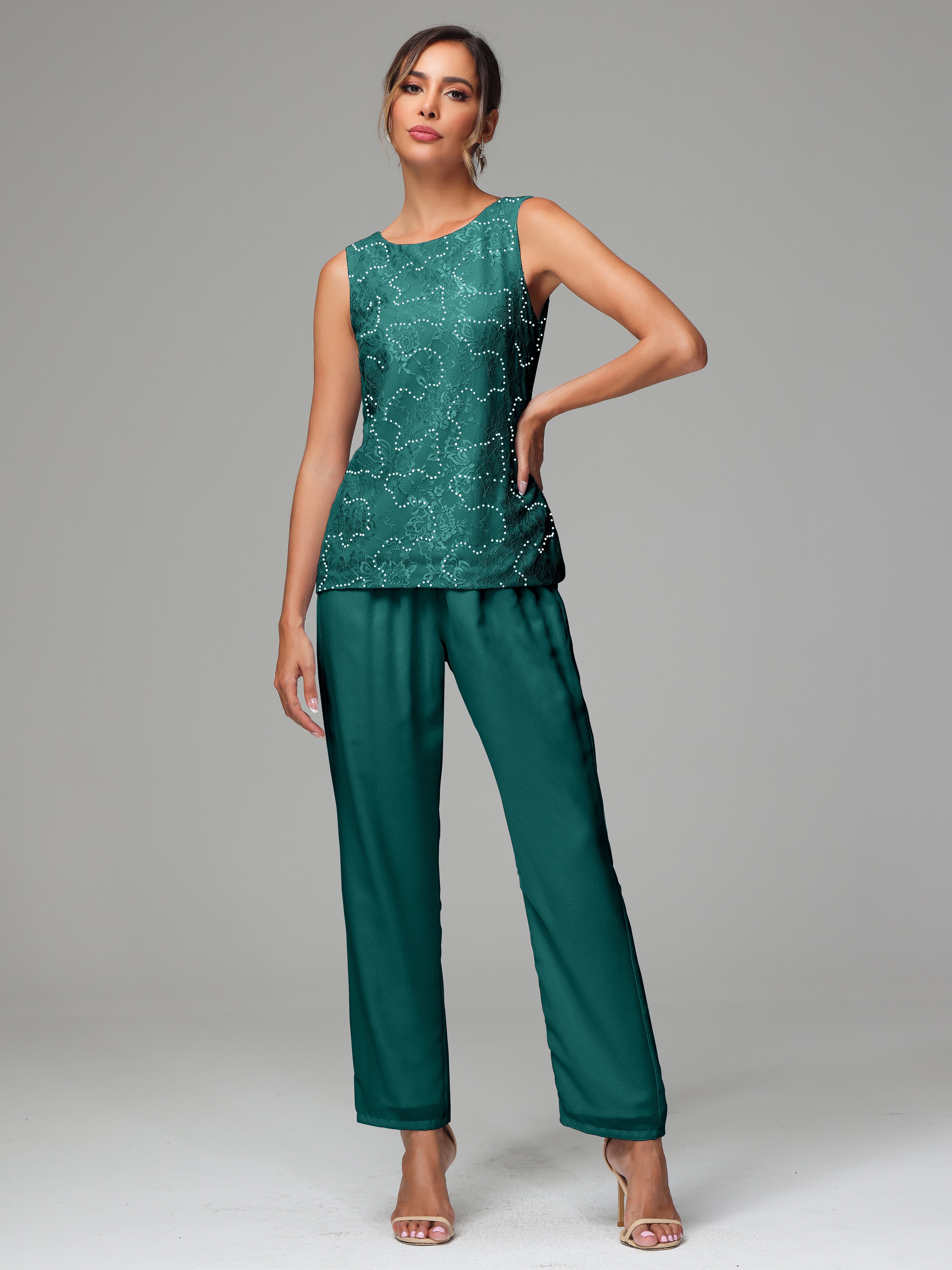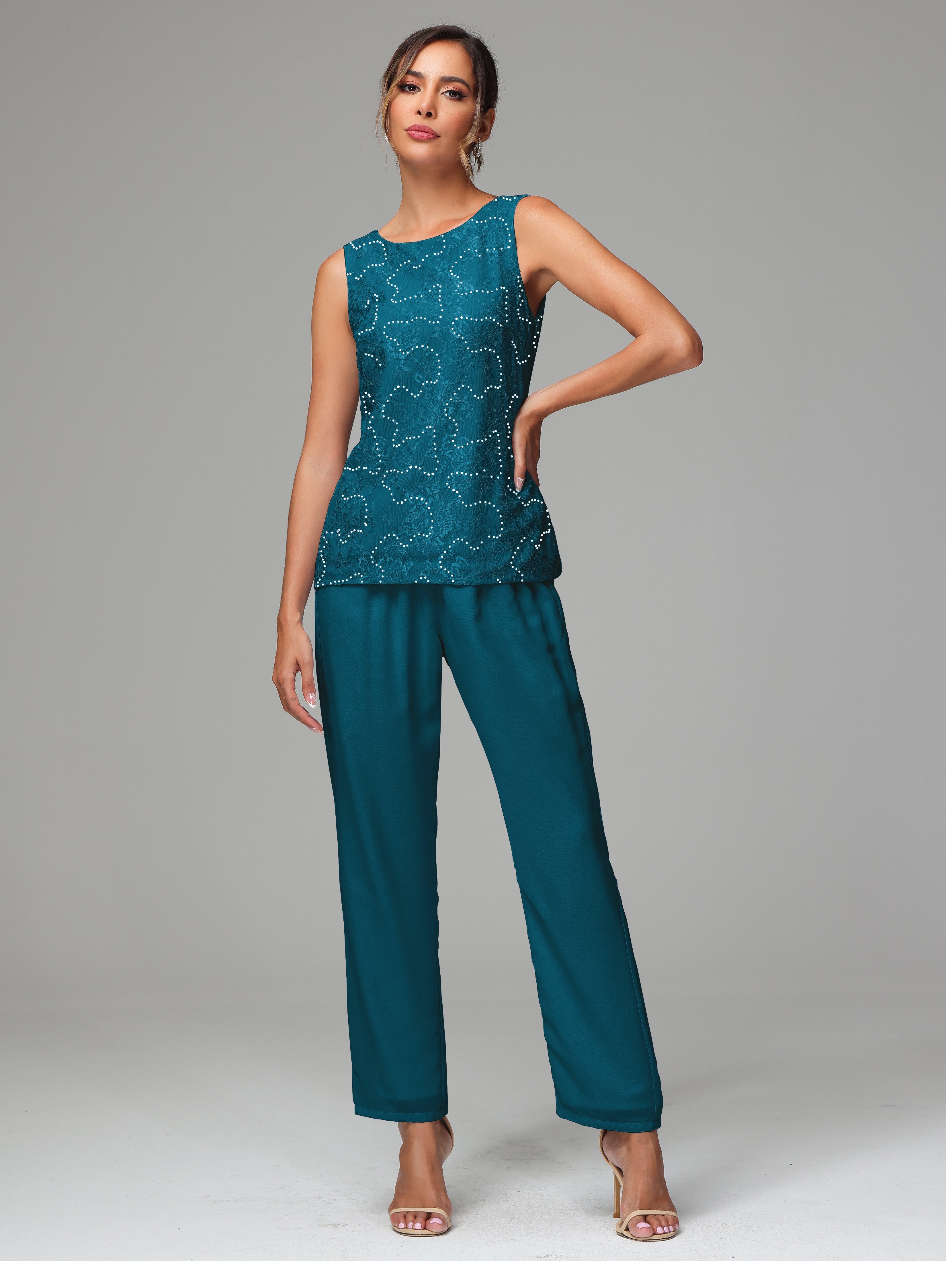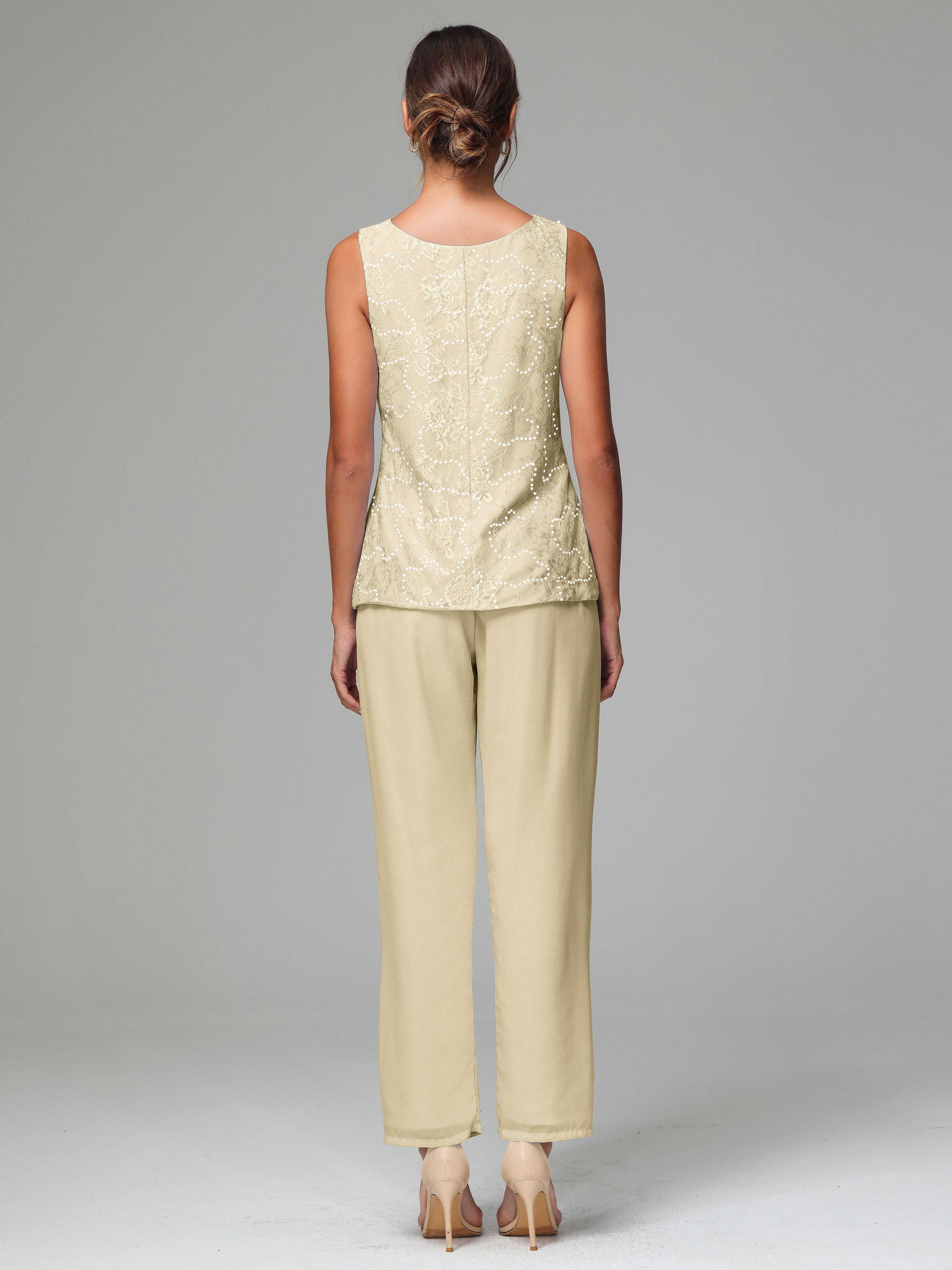 This three-piece chiffon lace mother of the bride dress pants suit offers a graceful, yet versatile look. Featuring long sleeves and a fashionable chiffon lace fabric, this timeless ensemble is perfect for any formal occasion.