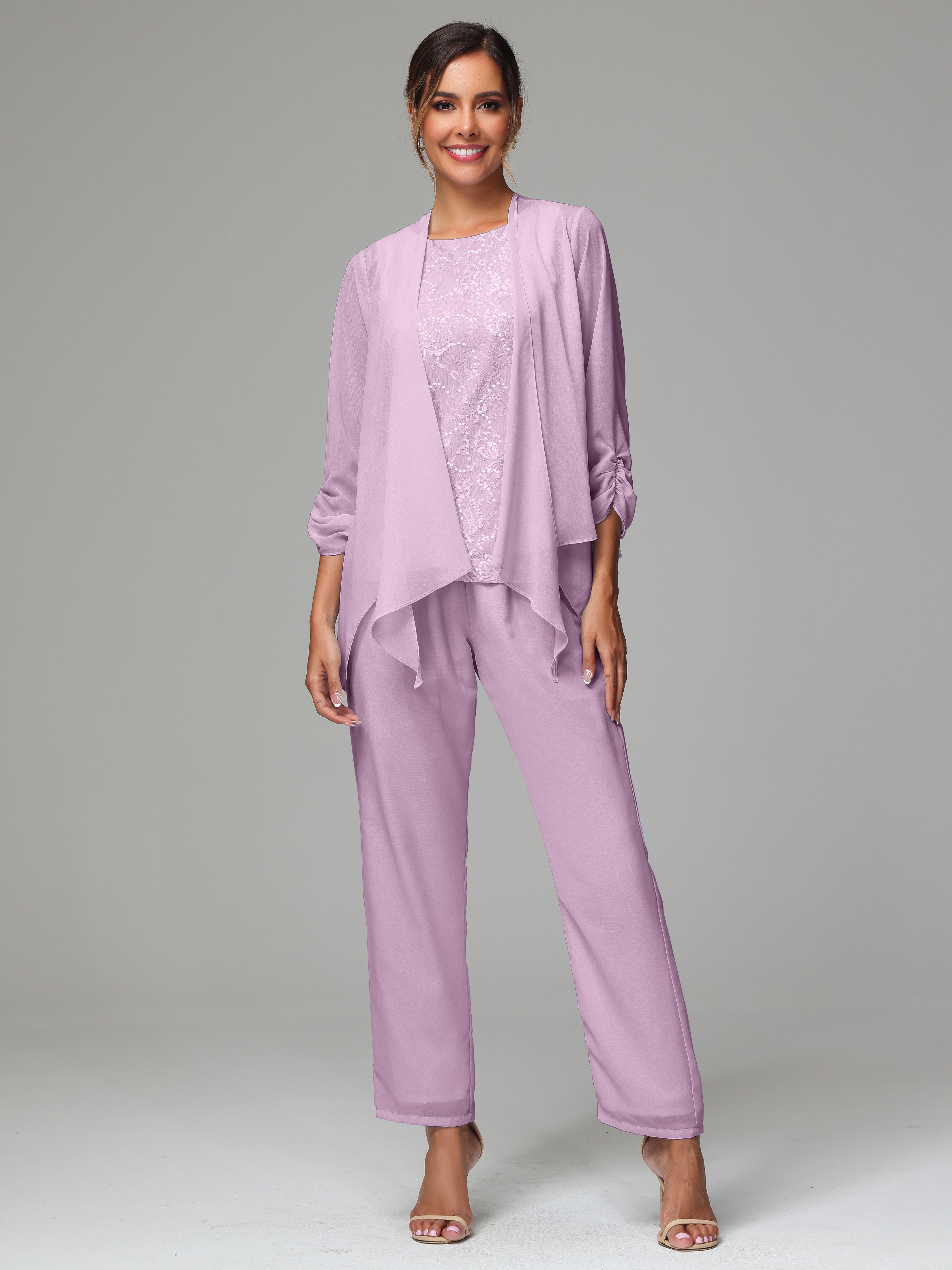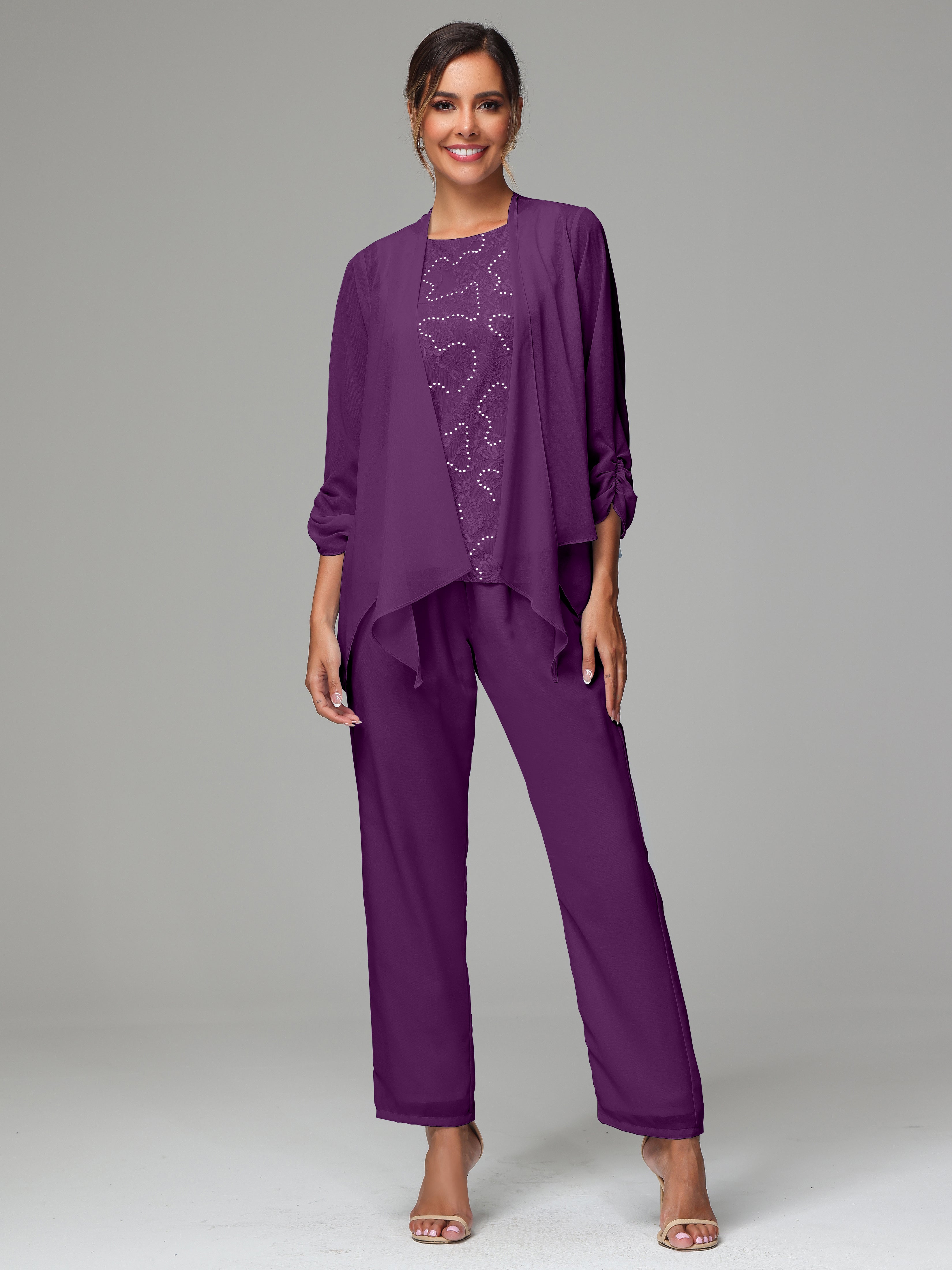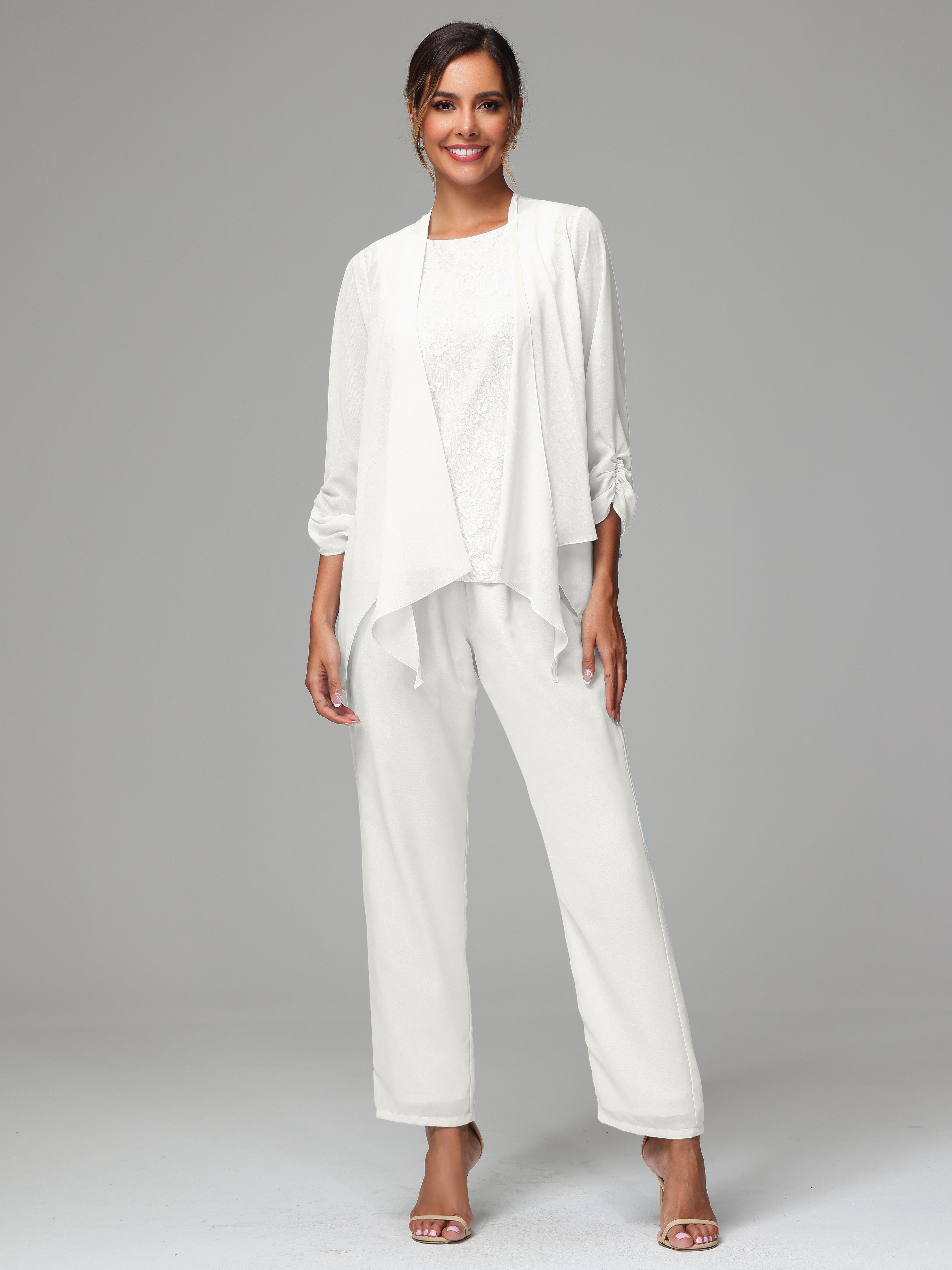 3 Pieces Chiffon Lace Long Sleeves Mother Of The Bride Dress Pants Suits