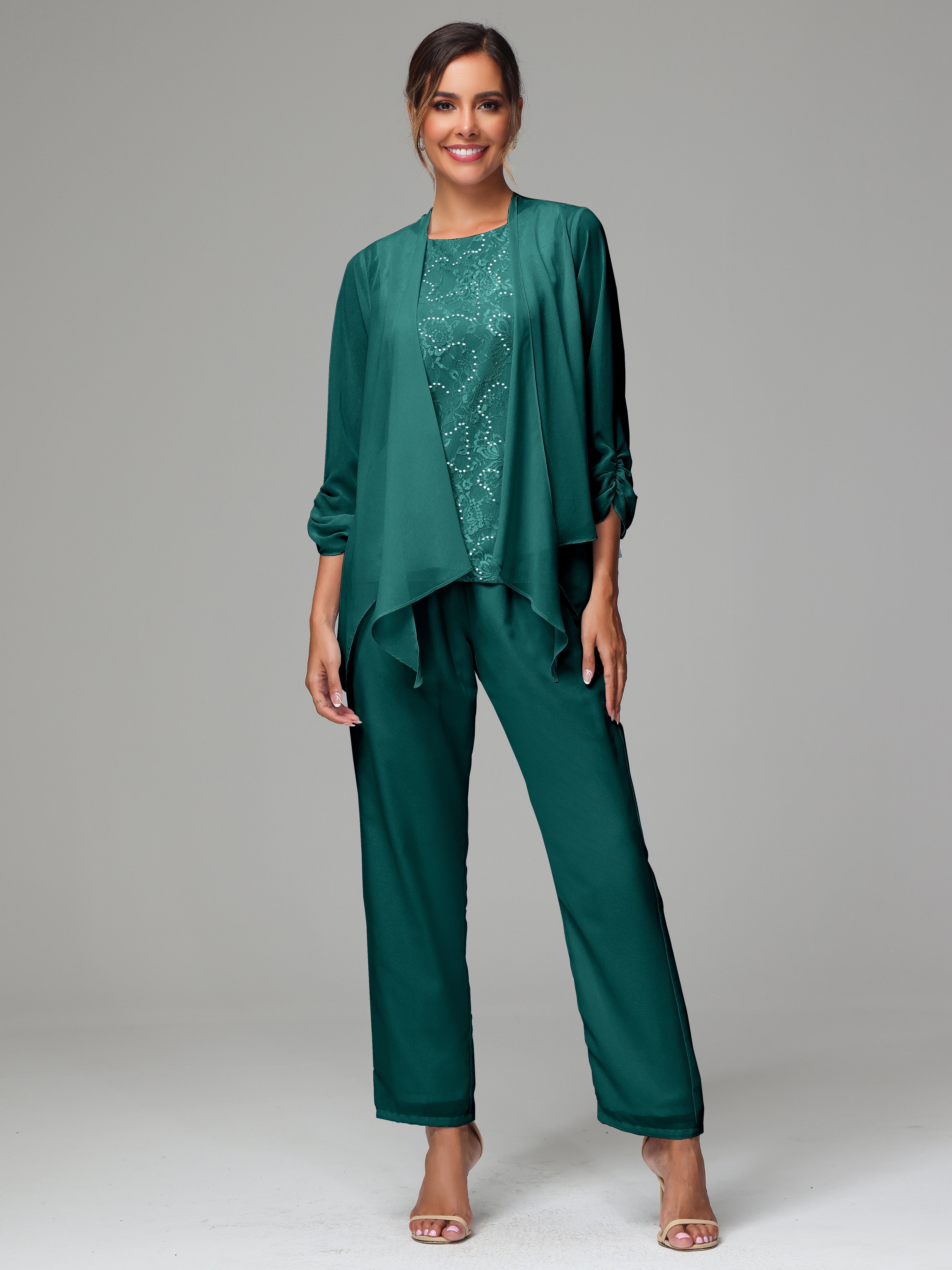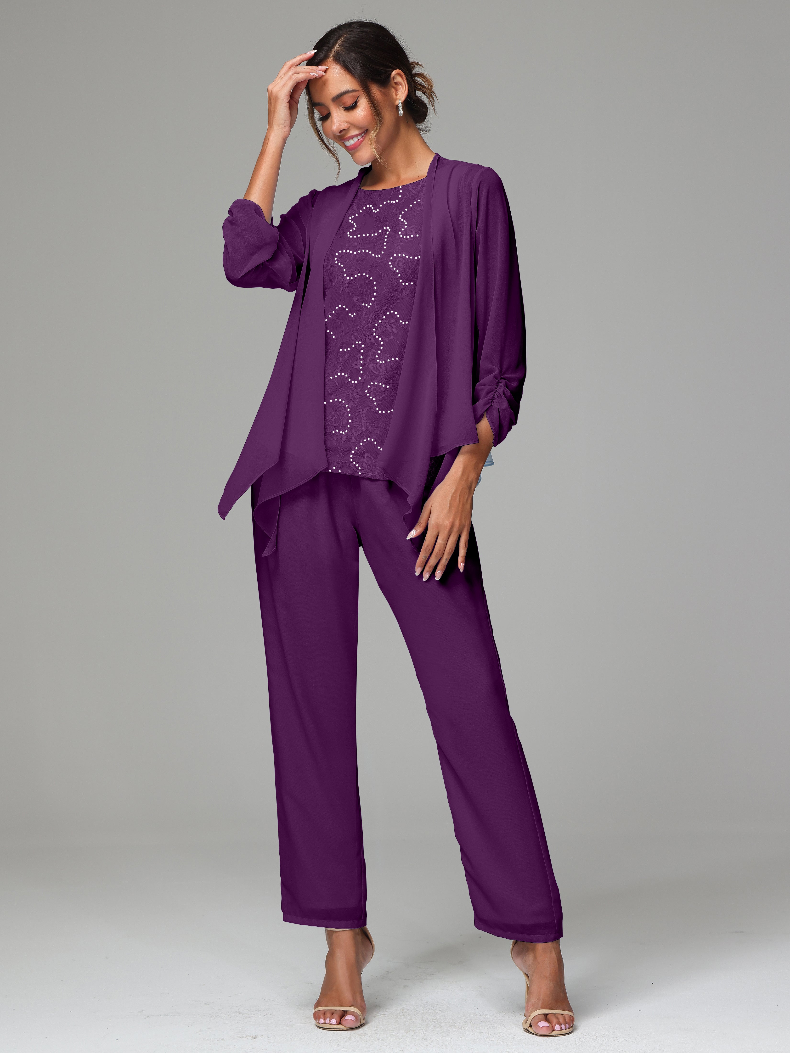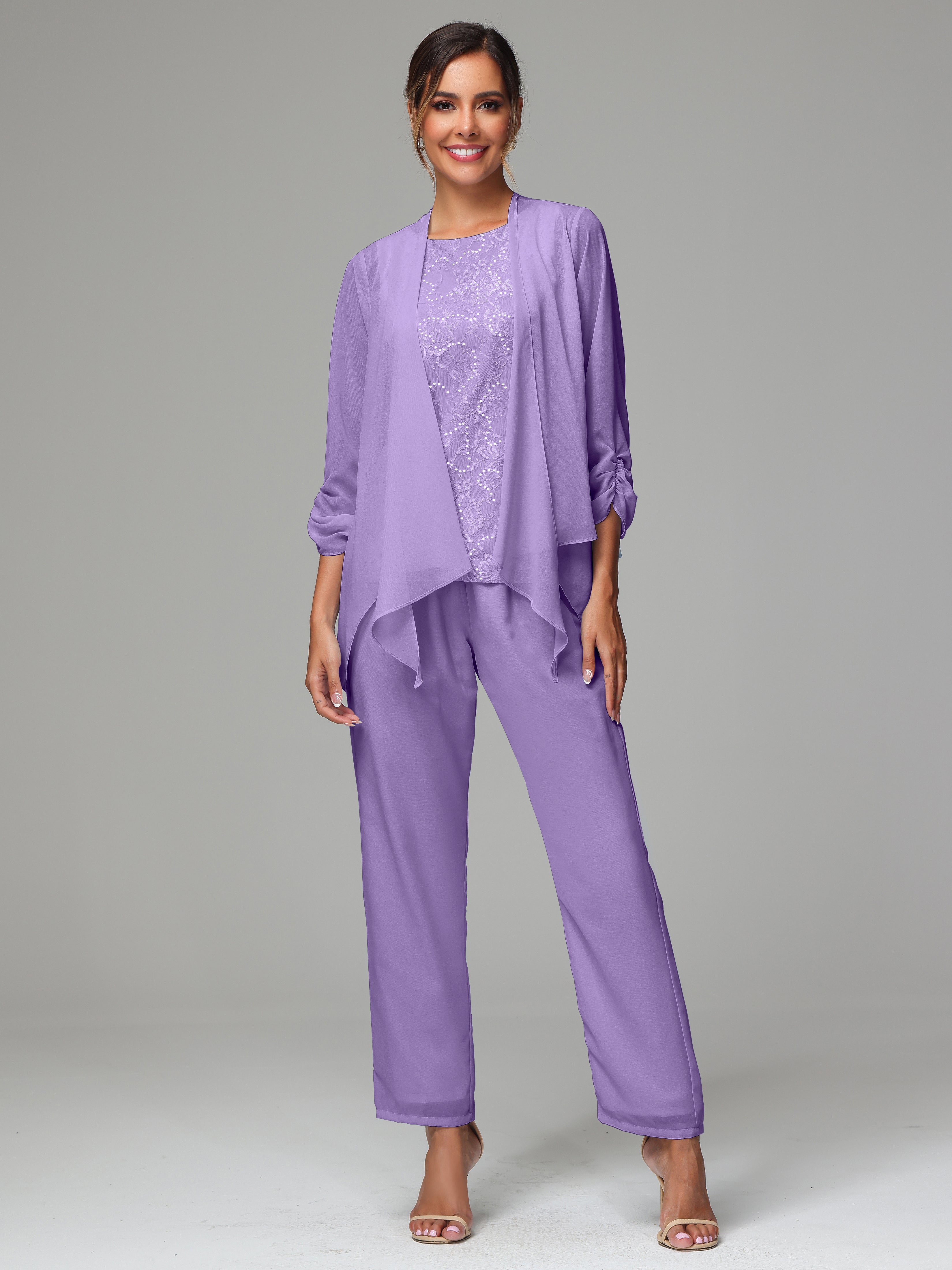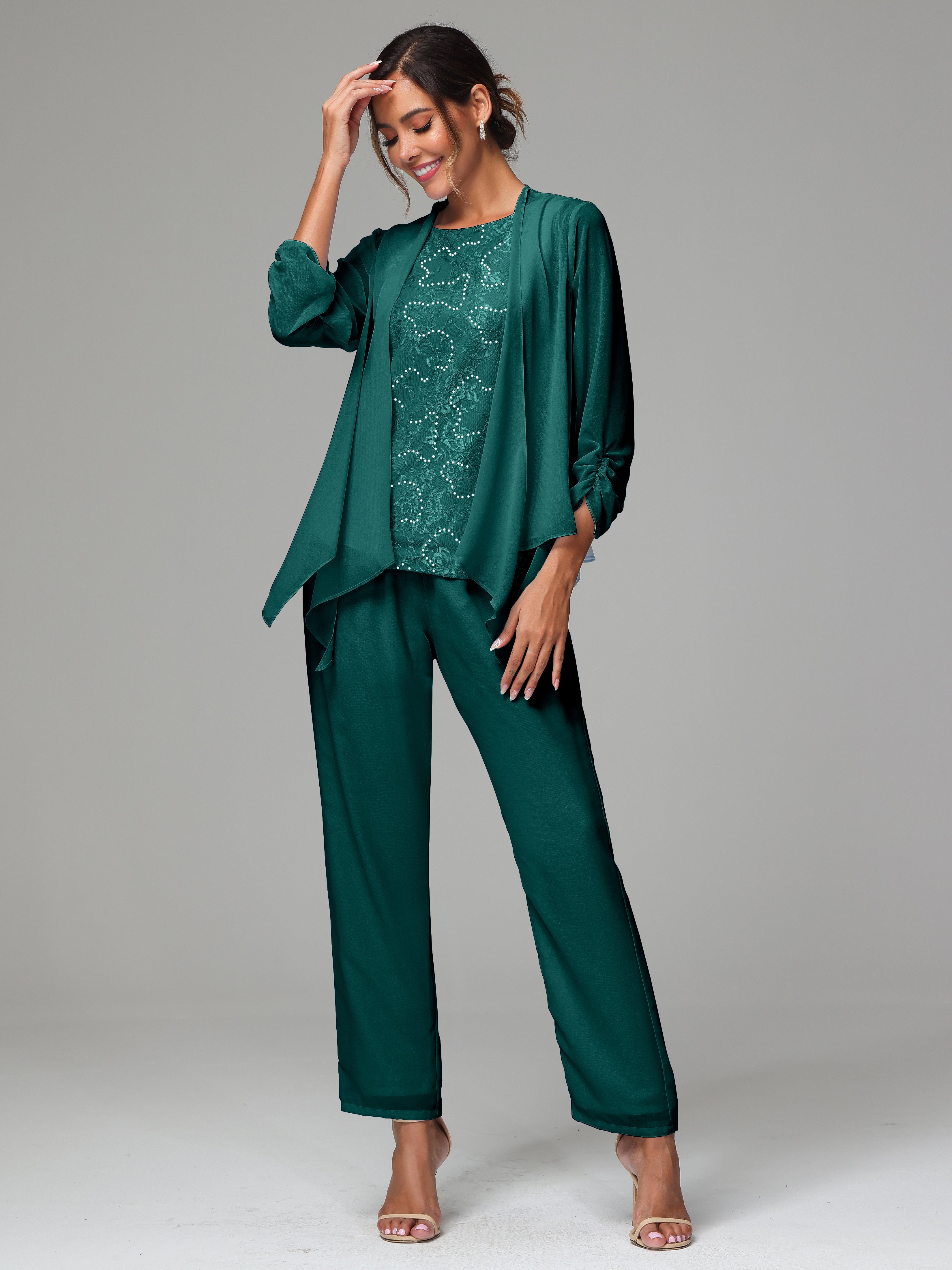 3 Pieces Chiffon Lace Long Sleeves Mother Of The Bride Dress Pants Suits